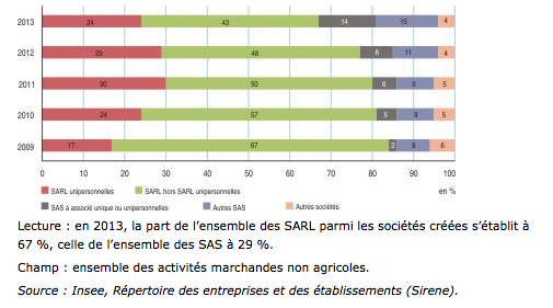 Même si la part des créations de SARL reste majoritaire dans les créations d’entreprises (57% en 2012), sa part décroit (91% en 2008) au profit de la SAS qui connait ses meilleures années avec un pourcentage de 39% de créateurs de sociétés par actions simplifiées.
